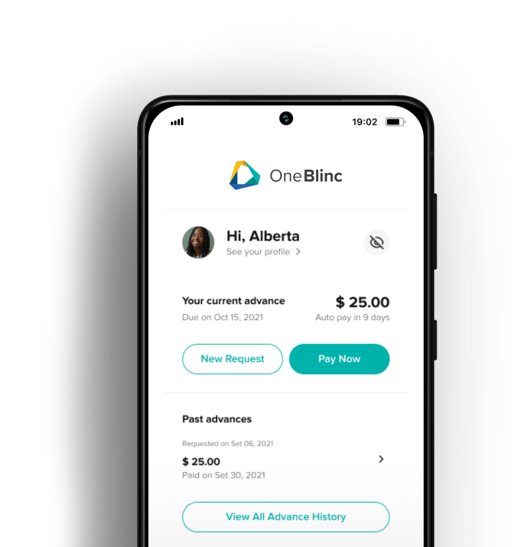 BlincAdvance will now be available whenever you need it. OneBlinc will deposit the advance directly into your bank account and/or debit card. We'll deduct what you borrow from your next paycheck, so you don't have to worry about due dates! Simply awesome.